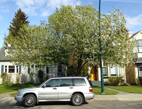 This is Kate's Mayday. It arrived in 1990 as a wedding gift certificate to Sunnyside Garden Centre from a neighbour. It was a puny 1" caliber and a mere 7 feet tall in spring of 1991. It seems to symbolize something about this house and yard, this carefully tended garden that Kate has owned in Upper Hillhurst since 1974. This is how the tree looked in early May 2013.